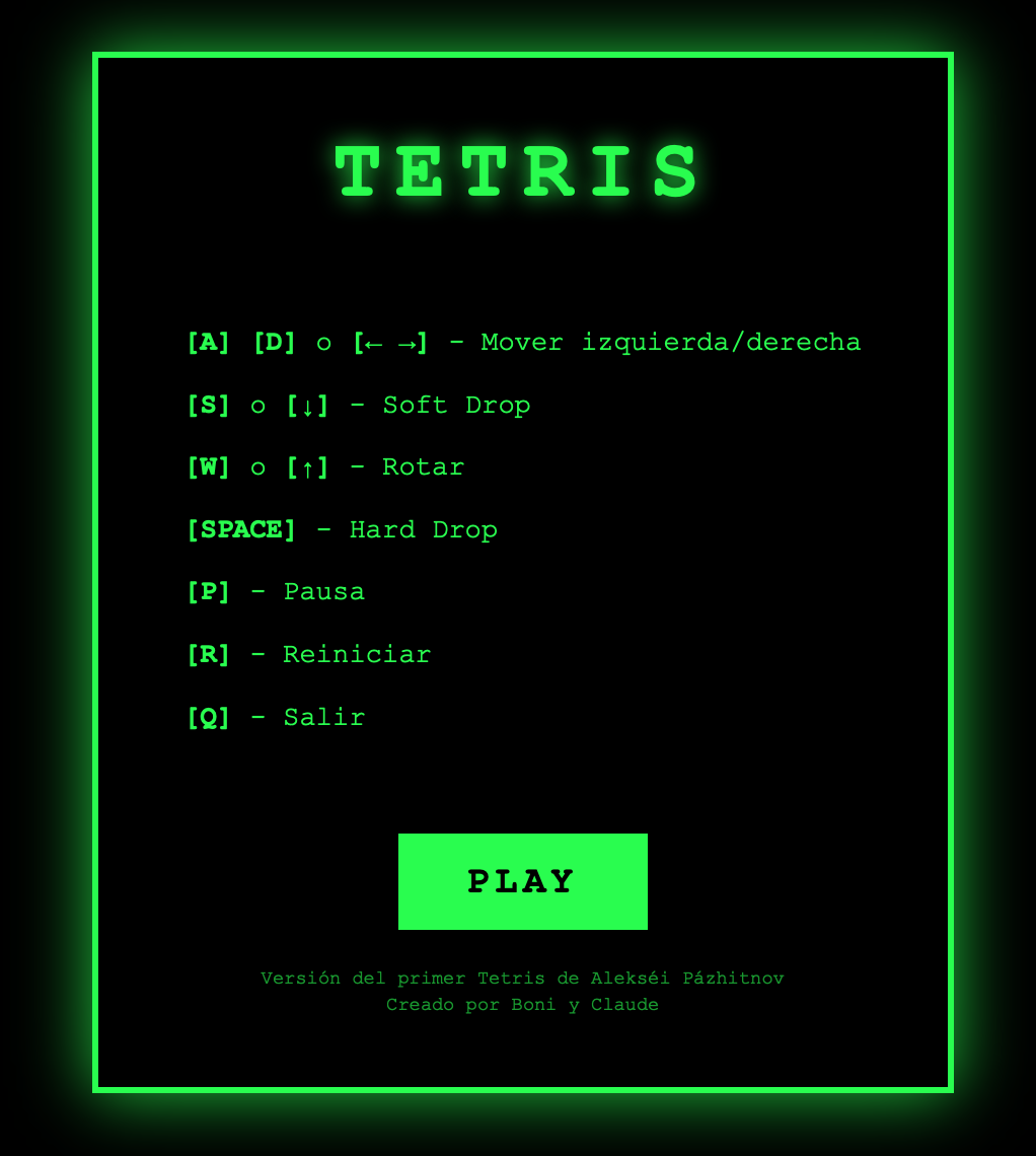 Versión del legendario Tetris creado por Alekséi Pázhitnov en 1984, reimaginado con gráficos ASCII y la vibra de las computadoras antiguas.